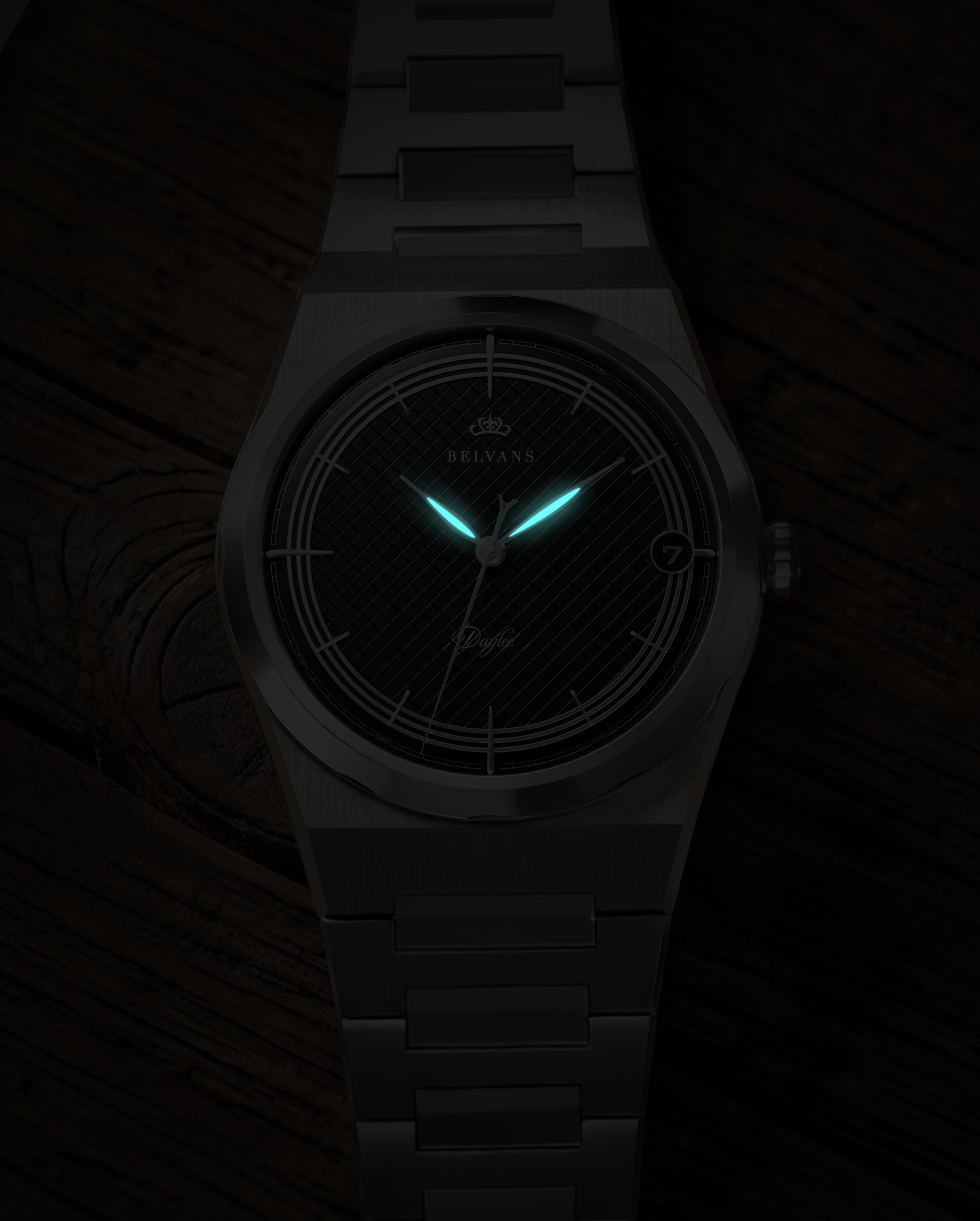 Nous voulions garder une ligne élégante, nette, presque évidente au premier regard, sans jamais sacrifier la lisibilité. C’est pour cela que nous avons choisi des aiguilles dauphines, habillées de Swiss Super-LumiNova® BGW9. Une matière lumineuse reconnue pour sa clarté, sa propreté visuelle et sa teinte froide, qui permet à la montre de conserver toute sa lecture, même lorsque la lumière baisse.
